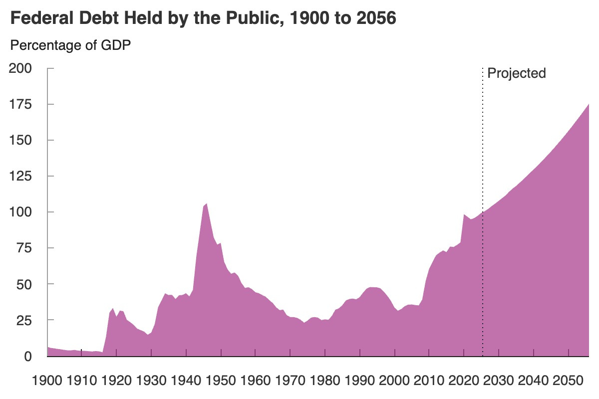 Further monetization is expected, and the Congressional Budget Office (CBO) forecasts rising debt. Deficits are expected to run at an annual rate of 5.6% to 6.7% per year from 2027 through 2036.