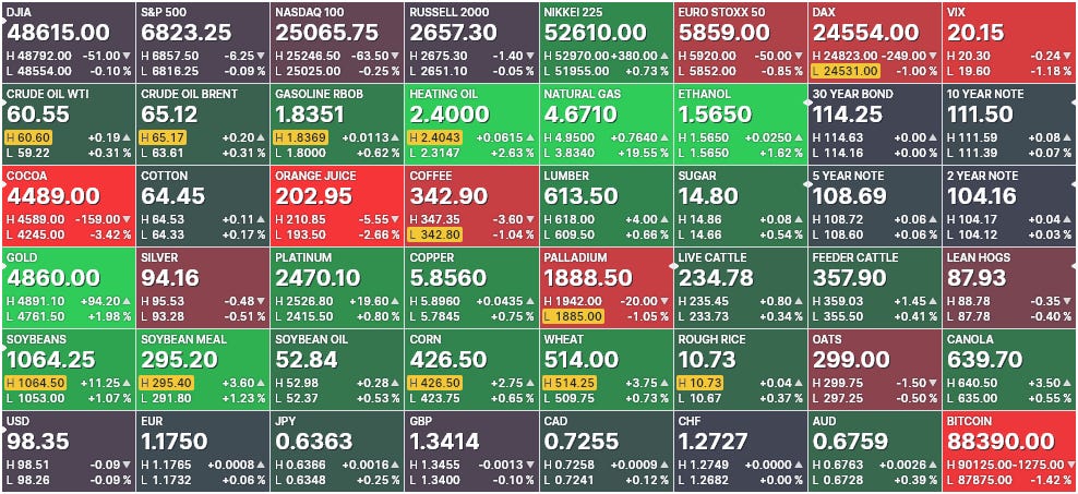 Natural gas is squeezing hard on the back of this cold snap. Keep an eye on it. Wait until it draws all of retail in, and once everybody and their mother starts talking about natural gas prices, and we hit overbought, that’s the moment to take a shot the other way. I’ll be looking for a trade on that as the week goes on. The problem is we have a big snowstorm coming this weekend, so it may keep this trade in the news a little longer than usual.