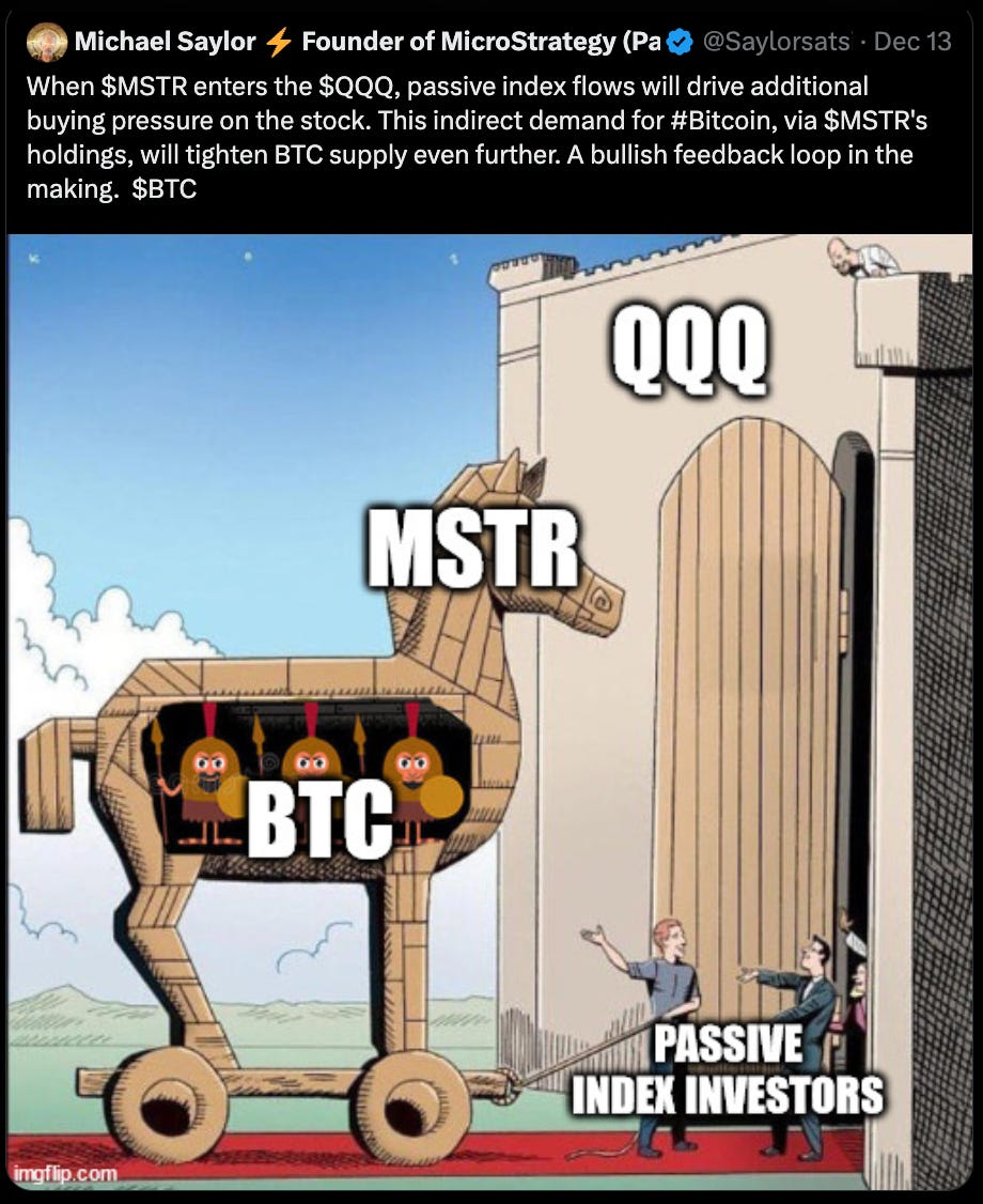 Effectively, the addition to the QQQ exploits a large pool of money that MUST buy MSTR stock whether the fund managers want to or not.