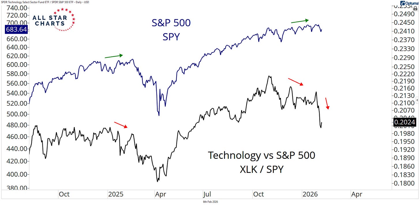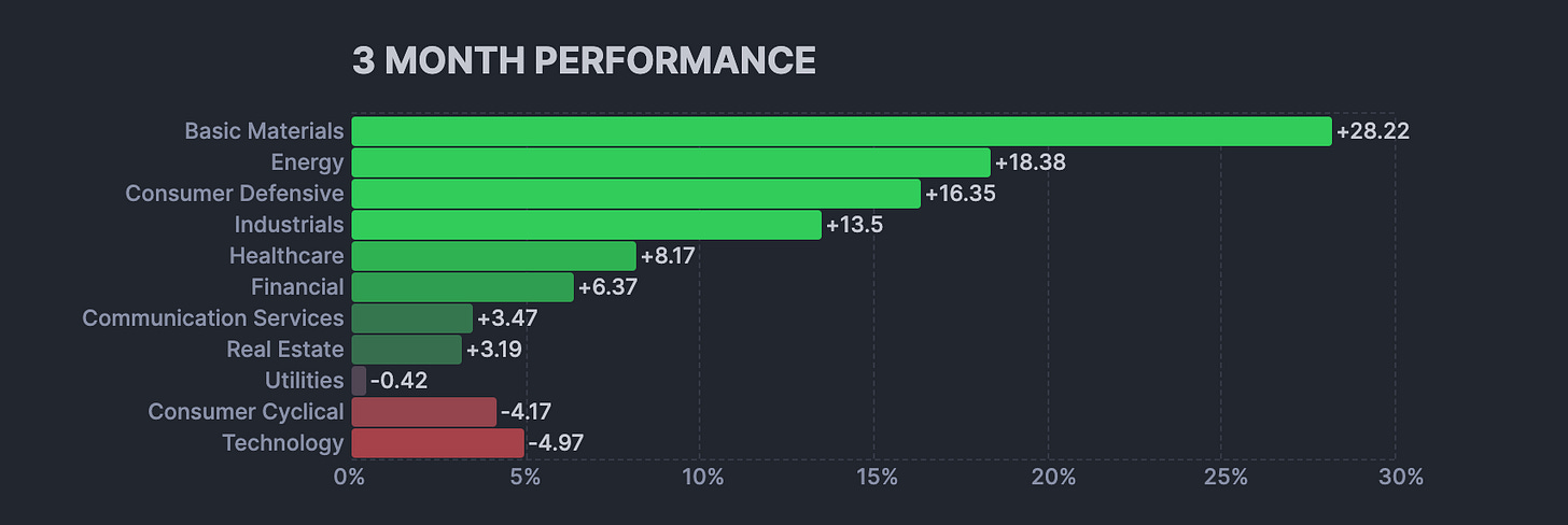 Liquidity might be at all time highs, but high-flying momentum has broken down. Leverage around those big tech names, software, and BTC has unwound, all while money rotated into energy, materials, and consumer defensives.