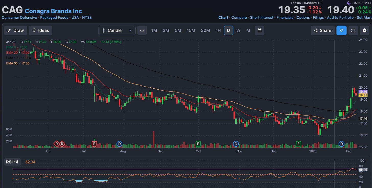 But if we start to see further economic weakness, and we start talking about rate cuts again, look for all the beaten-down names like Conagra (CAG), Campbell’s (CPB), and other food names to get a bid. For six months, I told people not to buy CAG unless it moves above its 50-day EMA and to set a 2% stop. It finally ran.