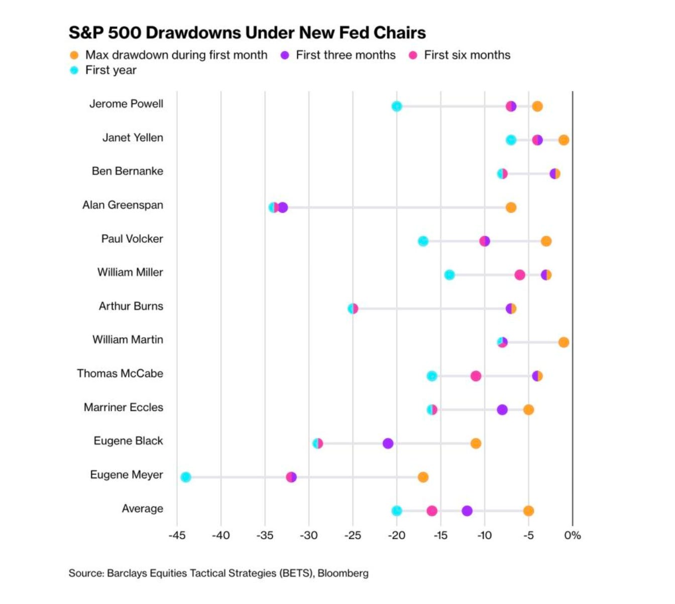 The chairs who came in during tightening or transition periods (Volcker, Burns, Powell) got hammered.